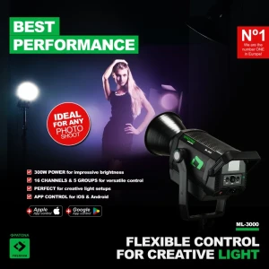 PATONA ML-3000 to zaawansowana lampa światła ciągłego oparta na technologii COB, która została zaprojektowana z myślą o profesjonalnych zastosowaniach w fotografii i produkcjach wideo. Dzięki potężnej mocy 300W, naturalnej temperaturze barwowej 5600K oraz uniwersalnemu mocowaniu Bowens, ML-3000 zapewnia precyzyjne, stabilne i niezwykle intensywne oświetlenie – niezależnie od warunków pracy.