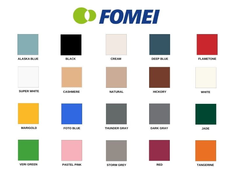 Alaska Blue, Super White, Marigold, Veri Green, Black, Cashmere, Foto Blue, Pastel Pink, Cream, Natural, Thunder Gray, Storm Grey, Deep Blue, Hickory, Dark Gray, Red, Flametone, White, Jade, Tangerine